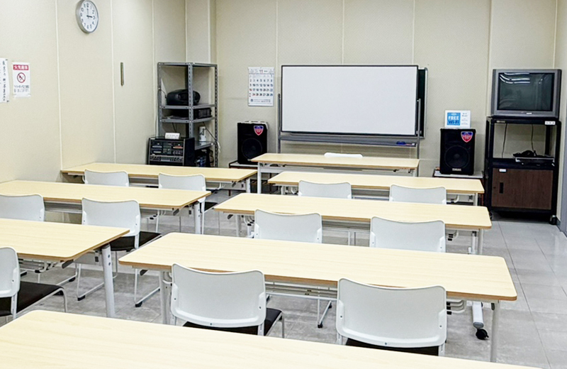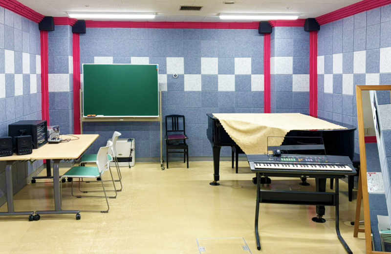 設備:長机/椅子/防音/黒板/音符黒板/スピーカー/DVDハードディスク/モニター